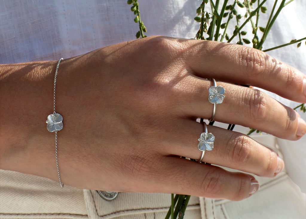 Det ikoniske firkløver armbånd har været et af Flora Danicas mest populære produkter gennem mere end syv årtier. Designet har naturen selv stået for, og den oprindelige struktur og små fine detaljer i firkløveren er vel bevaret.