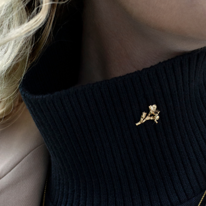 Pin brochen er håndlavet i sterlingsølv med en 22 karat forgyldning.