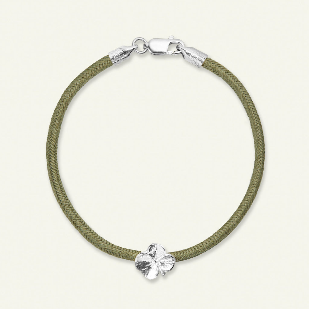 Flora Danicas firkløver kumihimo silkearmbånd er fremstillet af 100% genanvendt sterlingsølv og belagt med 22k guld. Armbåndet er 100% japansk silke og håndlavet i Kyoto.