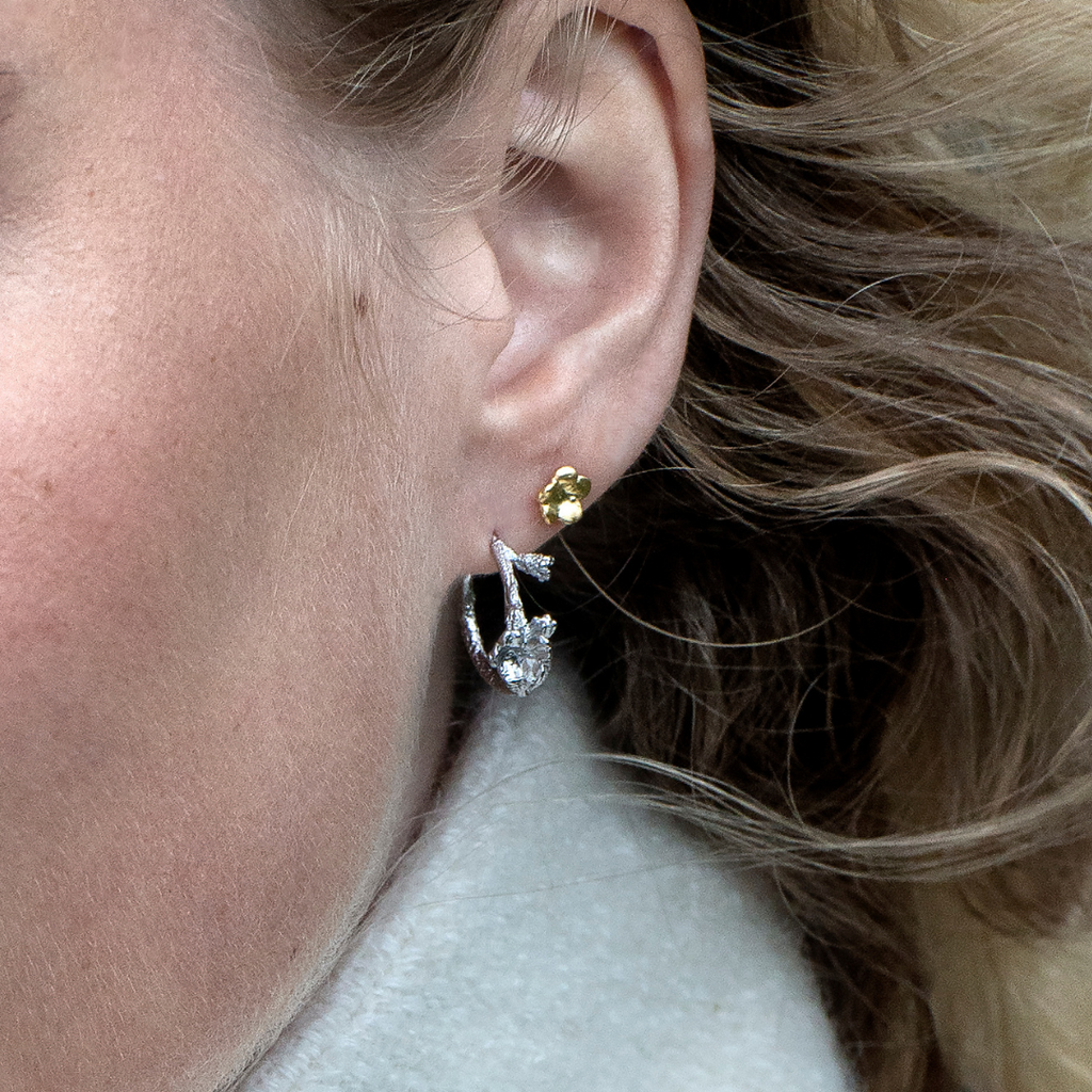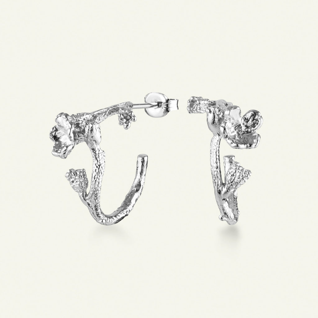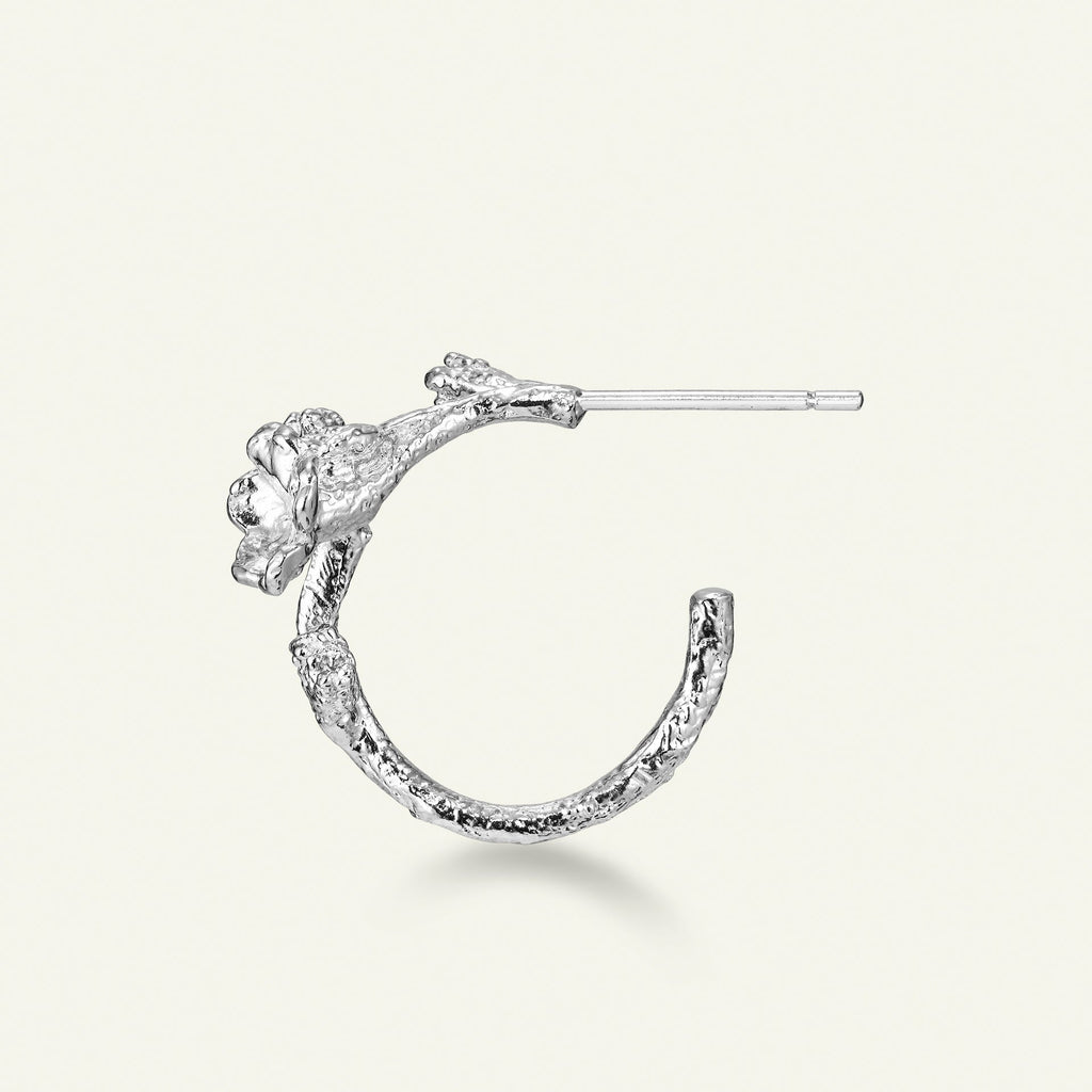 Forglemmigej hoop øreringe fra Flora Danicas 70-års jubilæums kollektion 2022. Øreringene har form som en bøjet stilk med en fin lille forglemmigej blomst på. Designet har naturen selv stået for, og den oprindelige struktur og små fine detaljer i både blomsten og på stilken er vel bevaret.