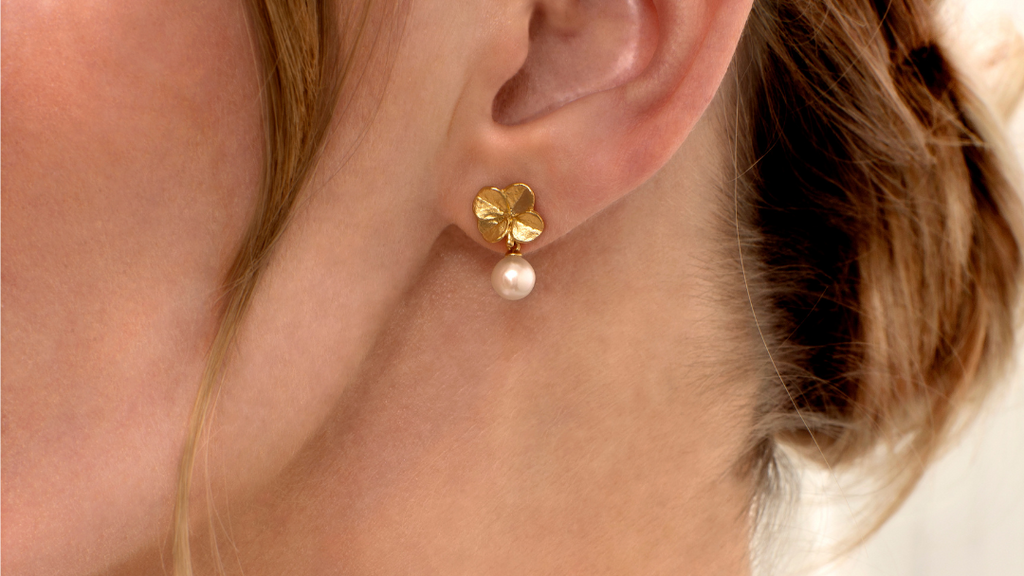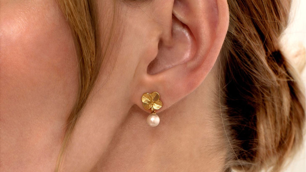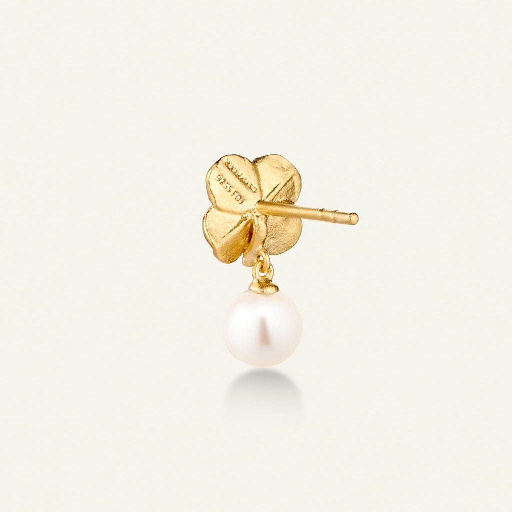 Ørestikkerne er håndlavet i 100% genanvendt sterlingsølv og belagt med 22 karat guld. Firkløverets fine struktur og naturlige detaljer bevares smukt, mens perlerne tilfører et strejf af elegance og eksklusivitet.