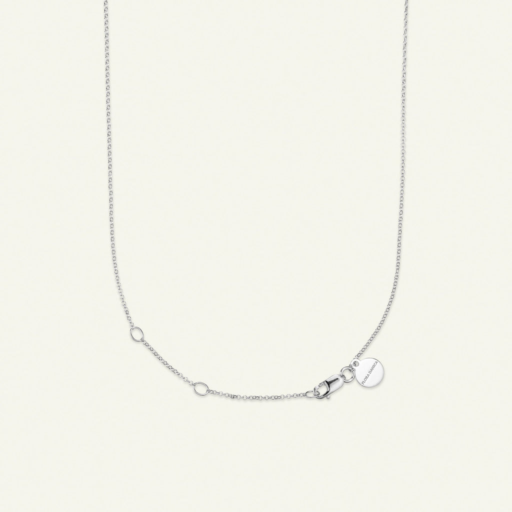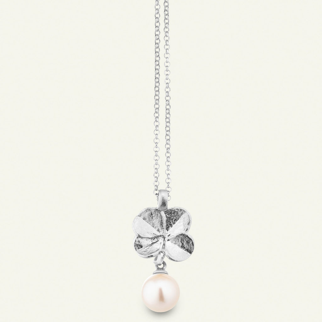 Vedhæng og kæde er udført i det fineste 100% genanvendte sterlingsølv belagt med rhodium. Firkløverets fine detaljer er vel bevaret, og perlen tilfører et ekstra strejf af eksklusivitet.