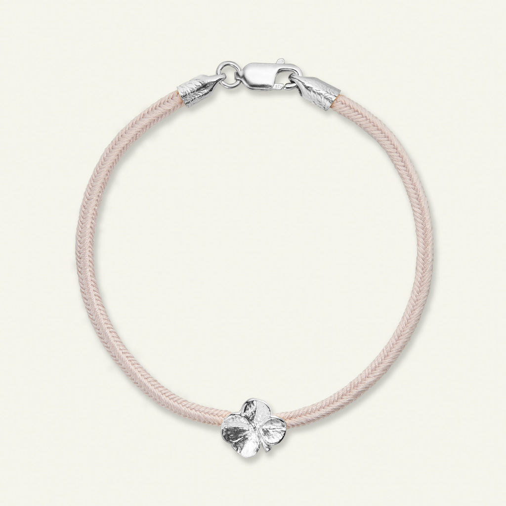Flora Danicas firkløver kumihimo silkearmbånd er fremstillet af 100% genanvendt sterlingsølv og belagt med 22k guld. Armbåndet er 100% japansk silke og håndlavet i Kyoto.