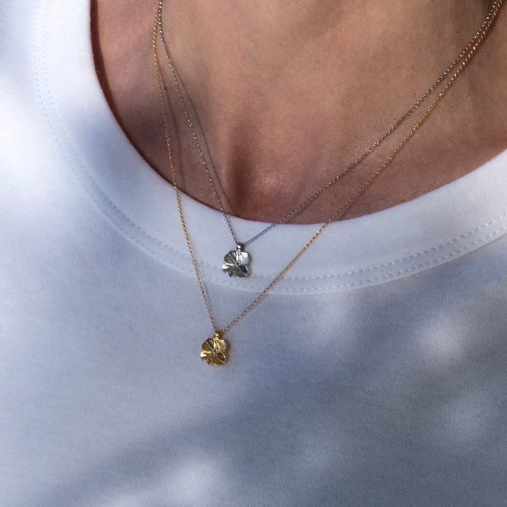Vedhæng og kæde er udført i det fineste 100% genanvendte sterlingsølv med en bæredygtig 22 karat forgyldning. Firkløverens højde (mm) 11,0. Bredde (mm) 9,2.