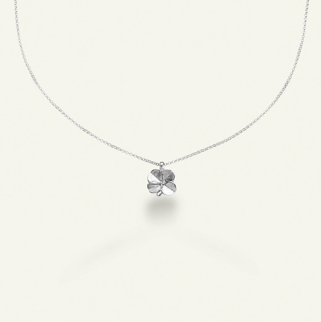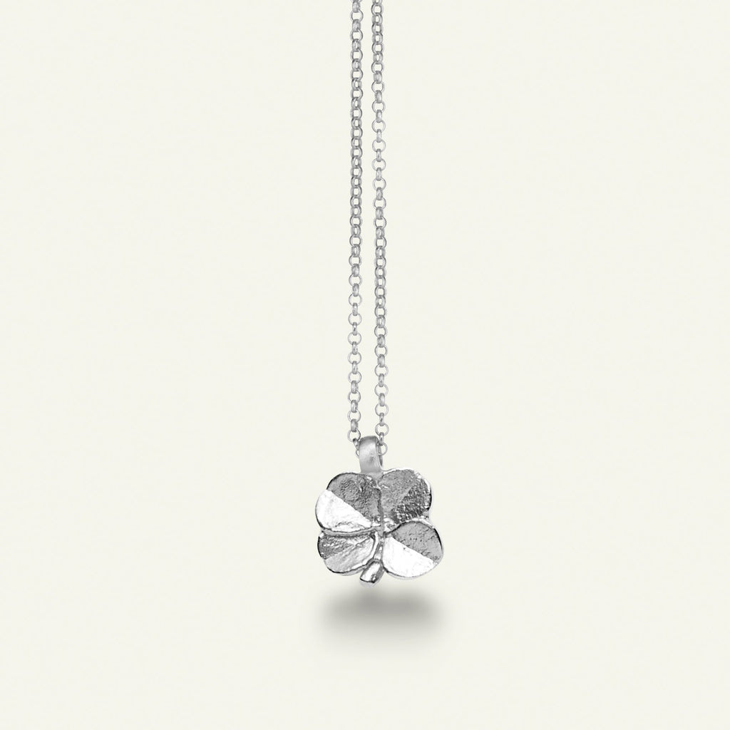Vedhæng og kæde er udført i 100% genanvendt 925 sterlingsølv belagt med rhodium. Firkløverens højde er (mm) 11,0. Bredde (mm) 9,2.