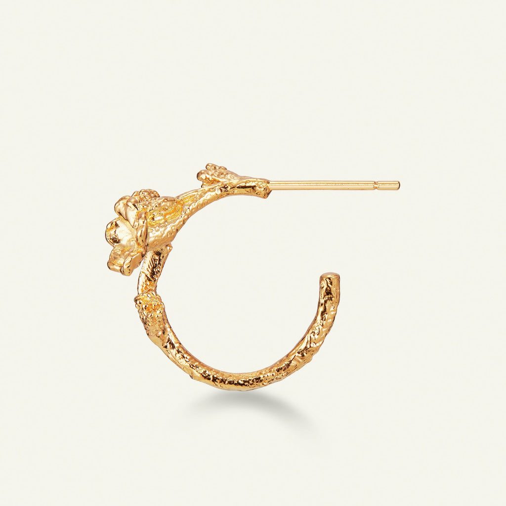 Forglemmigej hoop øreringe fra Flora Danicas 70-års jubilæums kollektion 2022. Øreringene har form som en bøjet stilk med en fin lille forglemmigej blomst på. Designet har naturen selv stået for, og den oprindelige struktur og små fine detaljer i både blomsten og på stilken er vel bevaret.