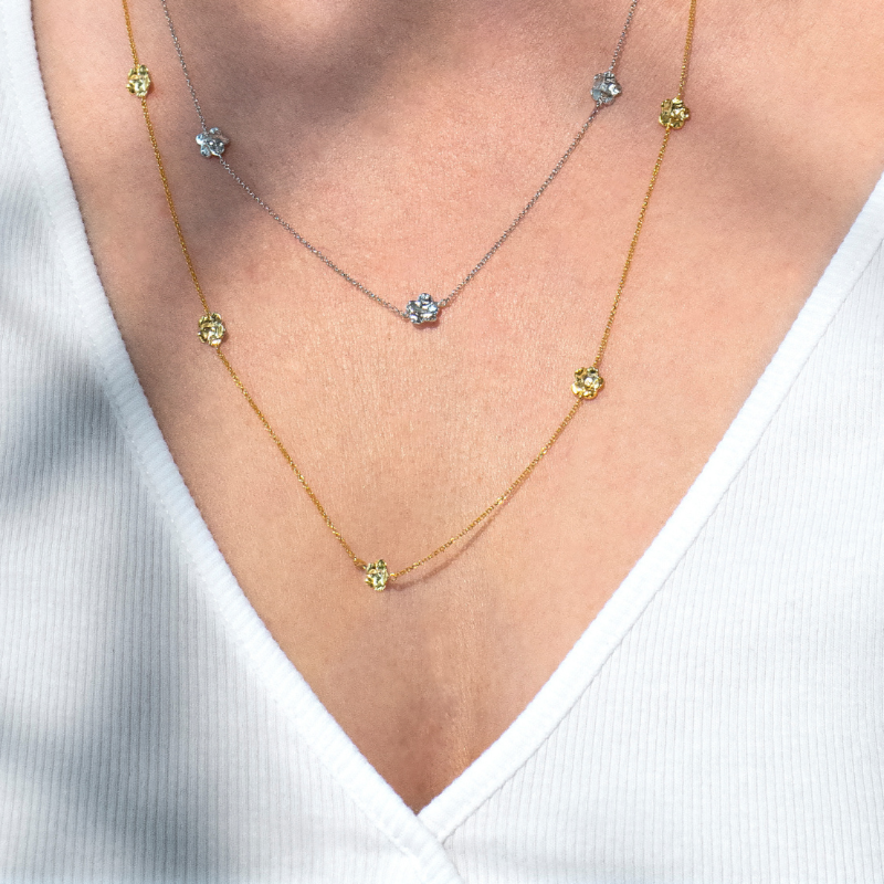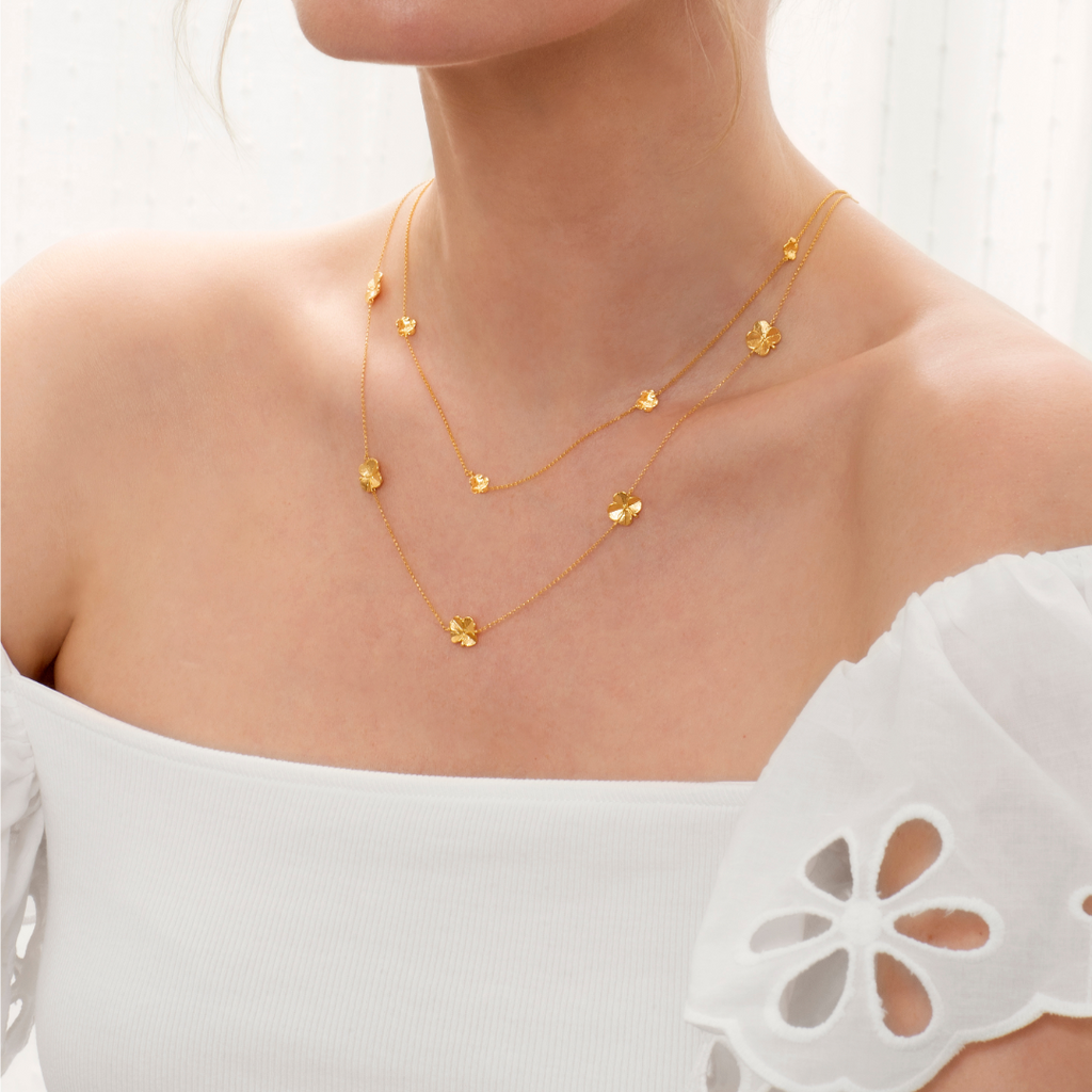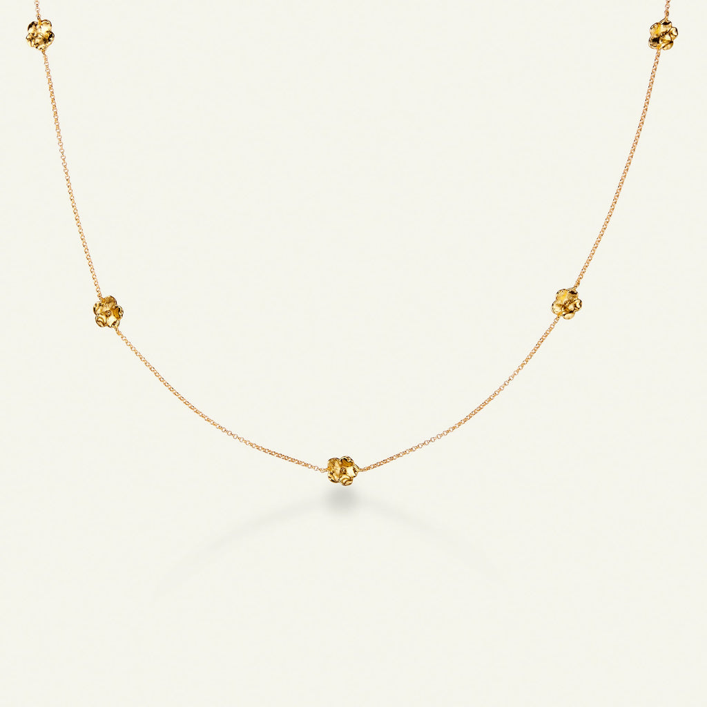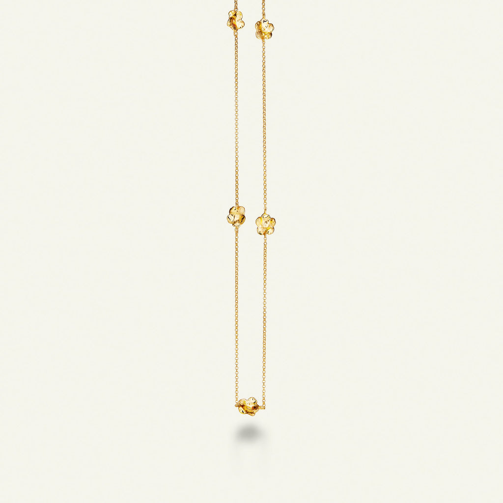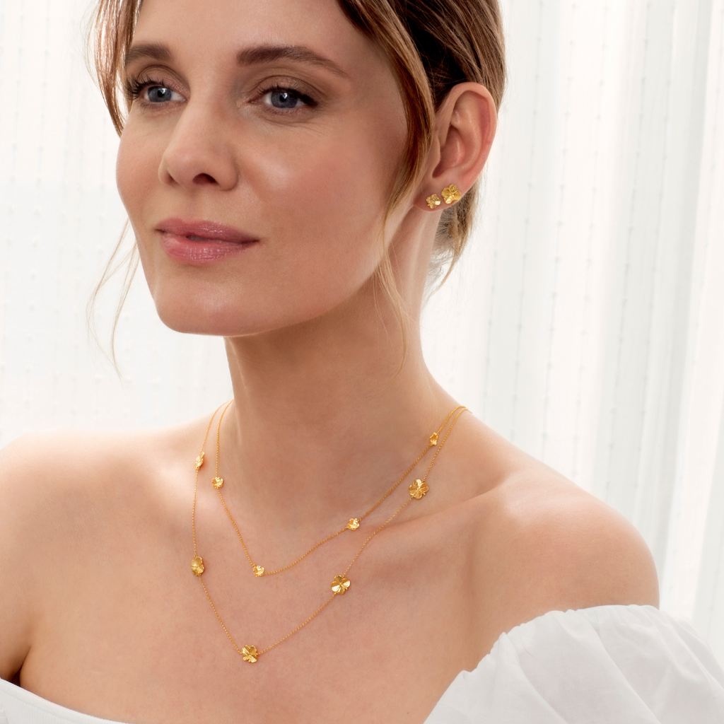 Forglemmigej er blandt de bedst sælgende kollektioner siden 1952 og symboliserer troskab, kærlighed og venskab. Smykket har fem små guldbelagte forglemmigej blomster på en fin kæde i justerbar længde (50, 55, 60 cm). Med sit enkle og elegante design er kæden perfekt at bruge til både hverdag og fest.