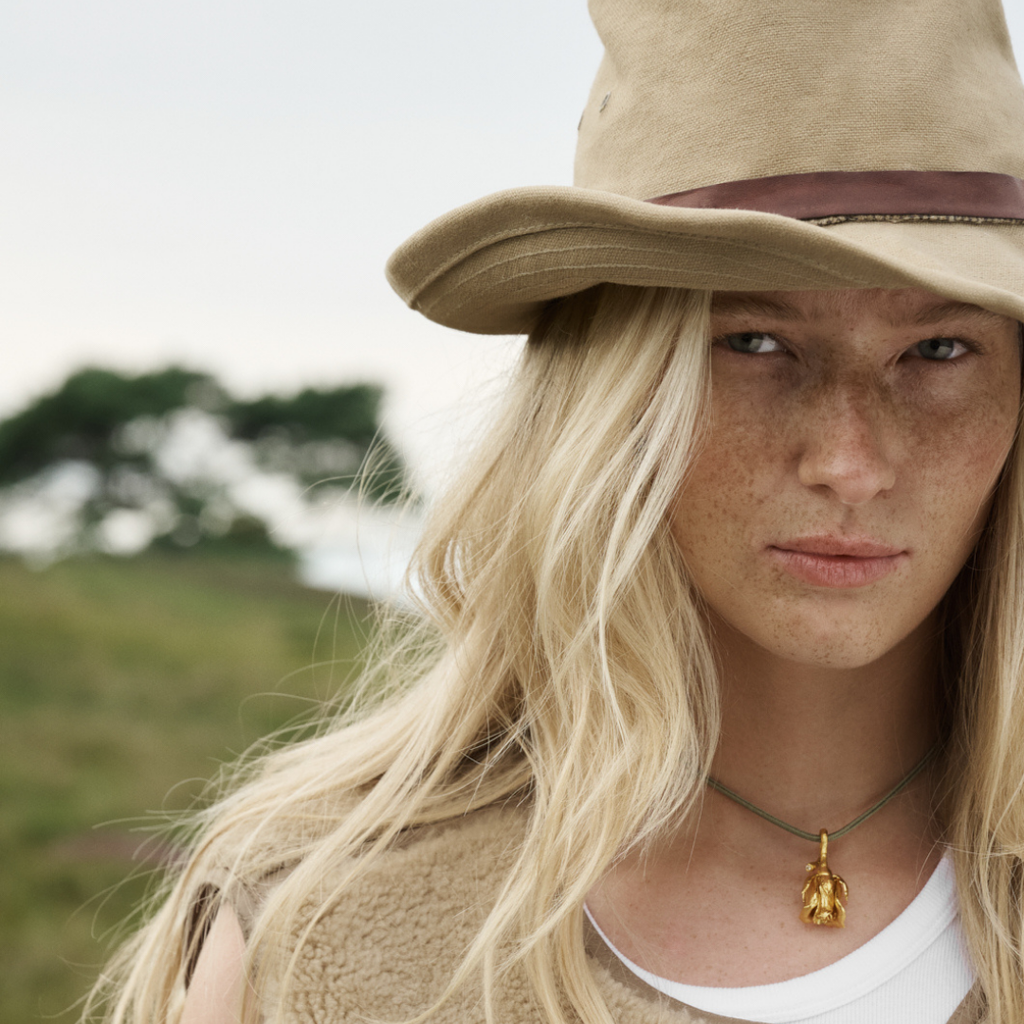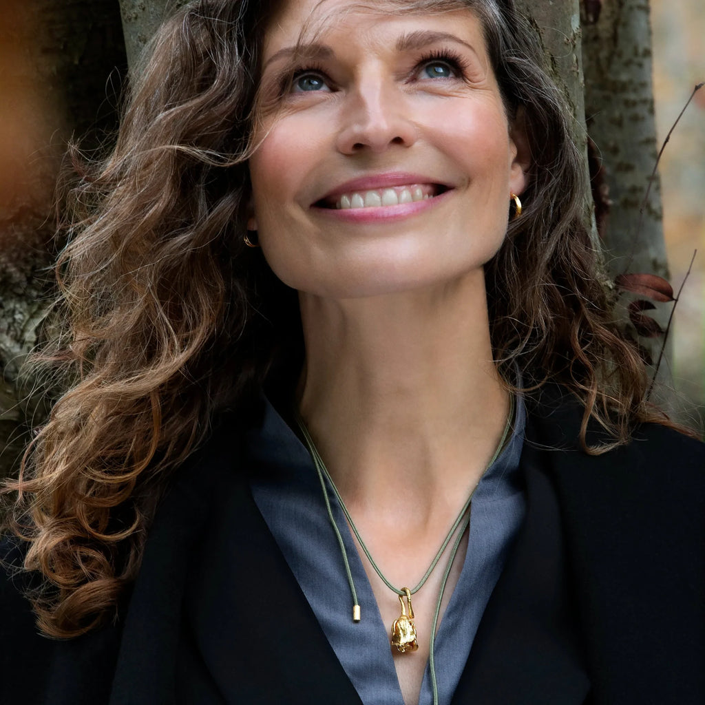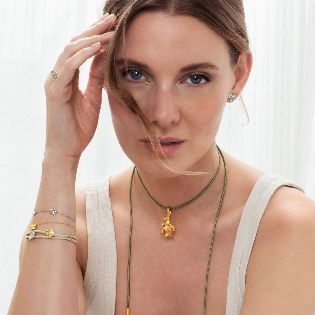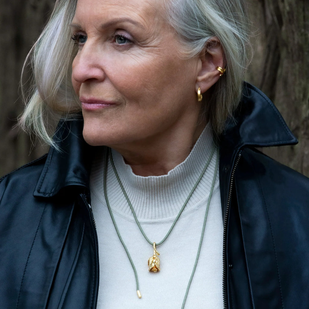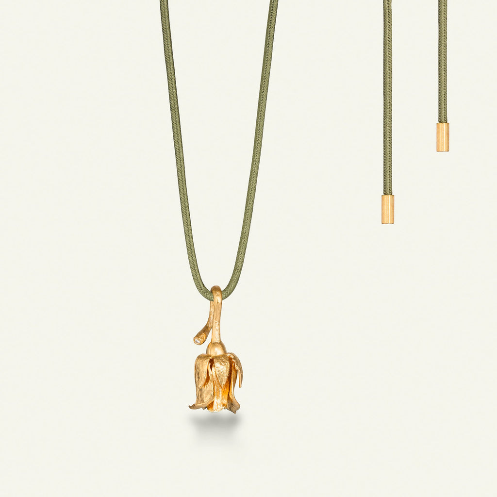 Rosen måler 3,2 cm i højden og 1,3 cm i bredden. Den er håndlavet i høj kvalitet og skabt med den største respekt for miljø og bæredygtighed i både produktion og materialer. Den er fremstillet af 100% genanvendt sterlingsølv og belagt med 22k bæredygtigt genanvendt guld. Snoren måler 120 cm og er håndlavet i Kyoto, Japan, af 100% japansk silke.