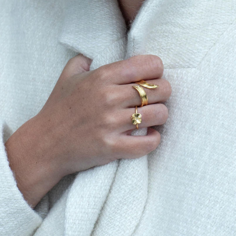 Græs ringen smyger sig elegant og naturligt omkring fingeren. Et unikt og sofistikeret design fra naturens side. Det originale græsstrå der er brugt til fremstilling af ringen blev plukket i den danske natur for mange årtier siden. Bemærk hvordan alle de naturlige strukturer og organiske elementer i græsstrået er bevaret. Designet af naturen selv og genskabt i massivt 18 karat guld.