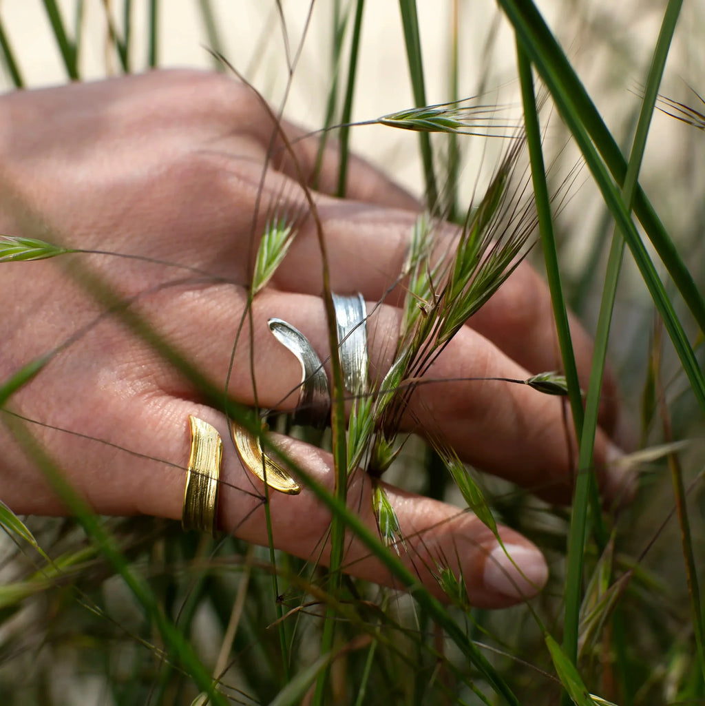 Græs ringen smyger sig elegant og naturligt omkring fingeren. Et unikt og sofistikeret design fra naturens side. Det originale græsstrå der er brugt til fremstilling af ringen blev plukket i den danske natur for mange årtier siden. Bemærk hvordan alle de naturlige strukturer og organiske elementer i græsstrået er bevaret. Designet af naturen selv og genskabt i 22 karat forgyldt sterlingsølv.